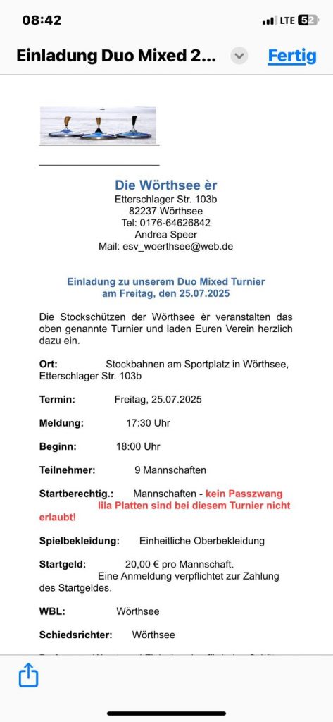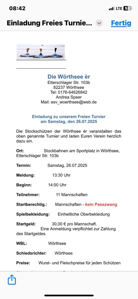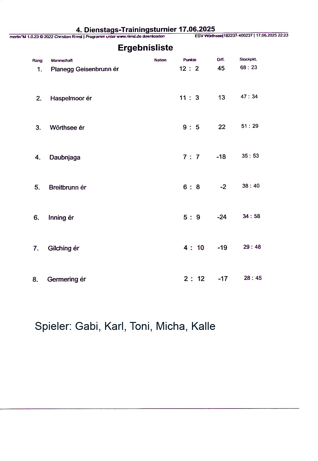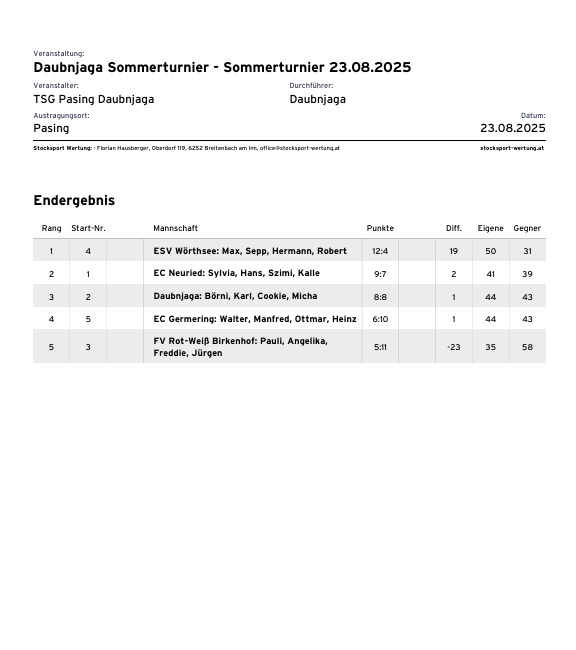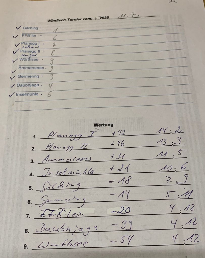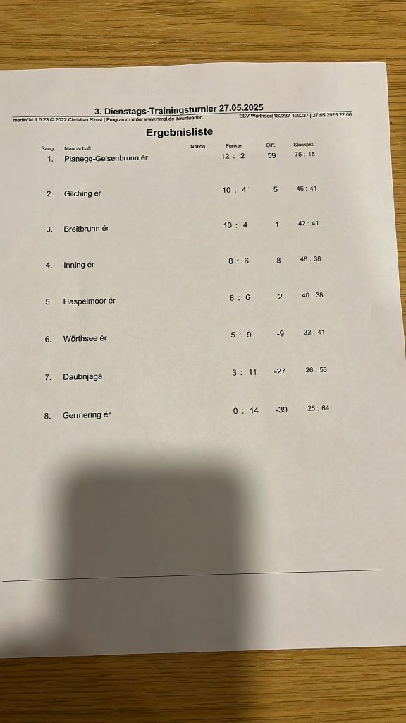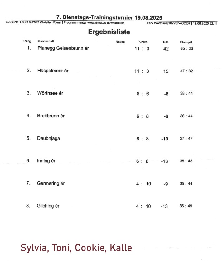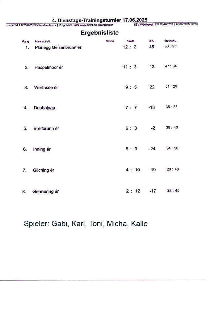 alle SpielerVerkündung …… der ErgebnisseESV Wörthsee – Platz 1EC Neuried – Platz 2WIR – Platz 3EC Germering – Platz 4FV RW Birkenhof Platz 5Wörthsee 19.08.2025 Sylvia, Toni, Cookie, KalleErgebnisliste 08.07.202508.07.25: Ben, Micha, Michi, CookieErgebnisliste 21.06.2025Sieger: Darko, Micha, Michi, Kalle2. Platz: Silvia, Anna, Carola, Robert3. Platz: unsere Vilstaler Wallermeister4. Platz: Gabi, Börni, Toni, Karlalle SpielerApre Turnier Feier 1Apre Turnier Feier 22025-06-17 ESV Wörthsee Platz 42025-06-14 EC Inselmühle Platz 414.06.2025: Sylvia, Hermann, Ralf und Kalle2025-06-06 Gilching ErgebnislisteGilching 06.06.25Gilching 23.05.2025 Platz 4Wörthsee 27.05.2025: Platz 7Einladung Wörthsee 25.07.2025 Mixed DUOEinladung ESV Wörthsee Freies Turnier 26.07.2025