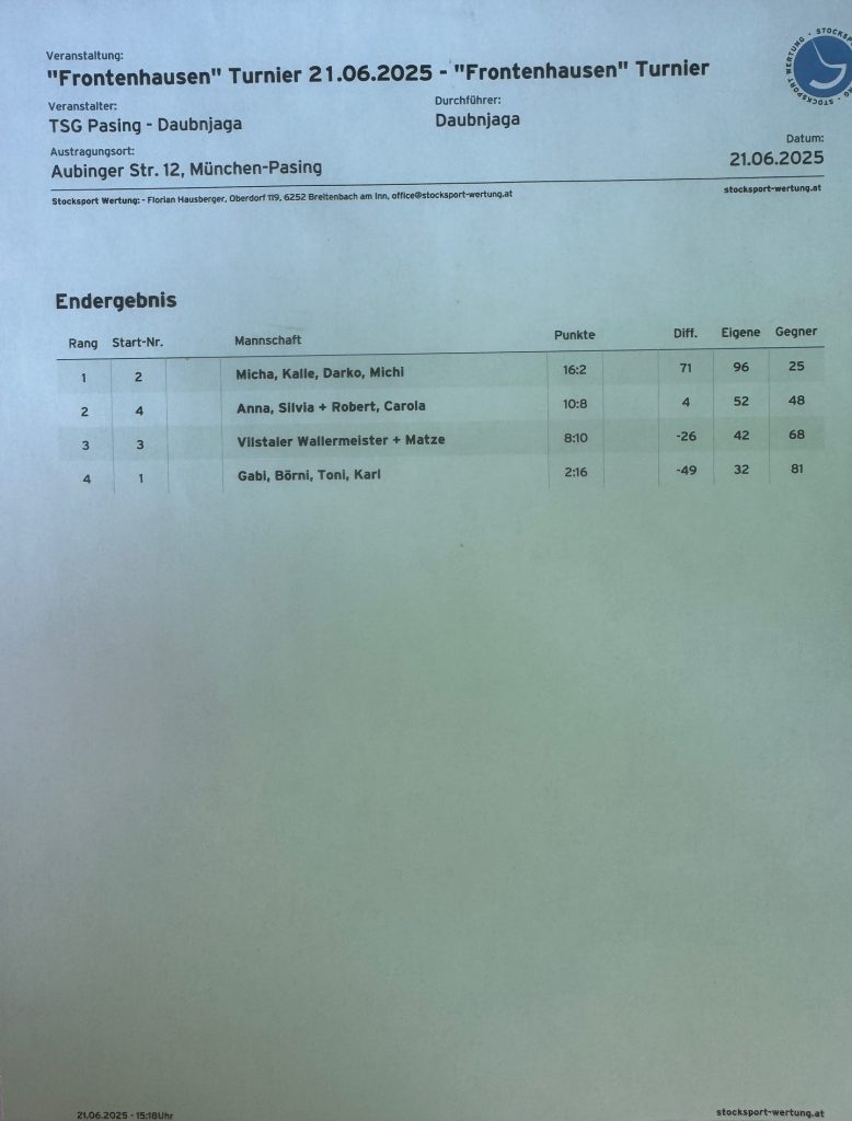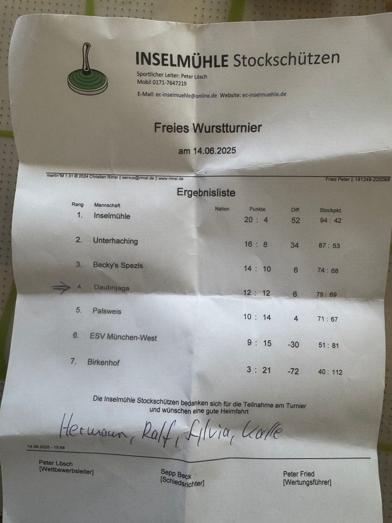 06.05.2025 Trainingsturnierserie 2025Gabi, Toni, Hermann und CookiePlatz 2 – 08:06anscheinend reichts nochfür die ein oder andere Maßsteht der Maibaum schief oder Julia?der Baum steht1. Mai 2025könnt´knapp werden mit dem TRINKgeld25.04.25 GilchingErgebnis: Platz 9Cookie, Max, Michi, Micha. Coach: Karl3. PlatzMicha, Michi, Cookie und Karl08.02.2025 Hirschgartenmit dem KulturvereinNeujahrsschiessen 2025Weihnachtsfeier 2024-2Weihnachtsfeier 2024-3Weihnachtsfeier 2024-1Nikolausturnier 2024-3Nikolausturnier 2024-2Nikolausturnier 2024-1Herbstturnier `24 – Neuried: Platz 2Herbstturnier `24 – Wörthsee: DIE SIEGER !Herbstturnier `24 – Inselmühle: Platz 3Herbstturnier `24 – Daubnjaga I: Platz 4Ergebnis Herbstturnier `24 – Daubnjaga II Platz 5Mannschaften Herbsturnier 12.10.2024Max`s geniale GulaschtaschenWarten auf den TurnierstartESV Turnier 21.09.2024 Daubnjaga und BuchloeFrontenhausen 28.09.2024: die MannschaftenZeitungsartikel: Turnier 28.09.2024 in FrontenhausenKampf der GigantenSieger: Cookie24.08.2024EC Inselmühle 13.07.24 – die Mannschaftdas Ergebnis…und jetzt die Profis am Werk…das schaut jetzt schon recht gut ausToni bewacht sein Ferkelalles wartet – Hunger !das lange Grillen beginnt – bei der Hitze!super Beifahrer bei Toni im Cabrio04.05.24: Versuch von Matze04.05.24: die Mannschaft – Micha, Smartie, Matze, Patrick, Kalle04.05.24: Smartie beim Schuss, der uns die Kehre bringt…04.05.24 – Zuschauer04.05.24 – Patrick in Hochform04.05.24 beim ESV München: der coolste Zuschauer…erhält der Daubnjaga Nachwuchs…den Bierpreis für’s Feiern !das Team: Toni, Micha, Mimi und Cookieleider Letzter, trotz solch genialer Maß…Saisonvorbereitung 2024: neue Markisestark besetztes Turnier mit 13 MannschaftenPlatz 9 – sehr gut! Gabi, Toni, Fotti, Ralf und MichaFreisitzbeleuchtung undaufgeräumtes Lager … !auf dem Puchheimer Volksfest…